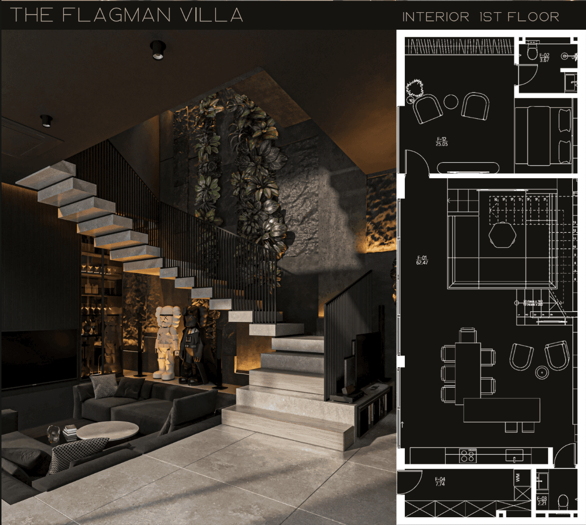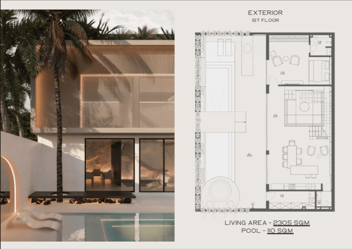 The Flagman Villa is the centerpiece of the White Villas complex, offering 313 m² of thoughtfully designed living space. This spacious residence features four private bedrooms with walk-in closets and en-suite bathrooms, a large open-plan living area with an integrated kitchen, and multiple workspaces ideal for remote living. The villa includes a private pool, jacuzzi lounge zone, rooftop terrace with sunset views, and a fully integrated smart home system controlling lighting, climate, security, and multimedia, creating a seamless blend of comfort, technology, and architectural impact.